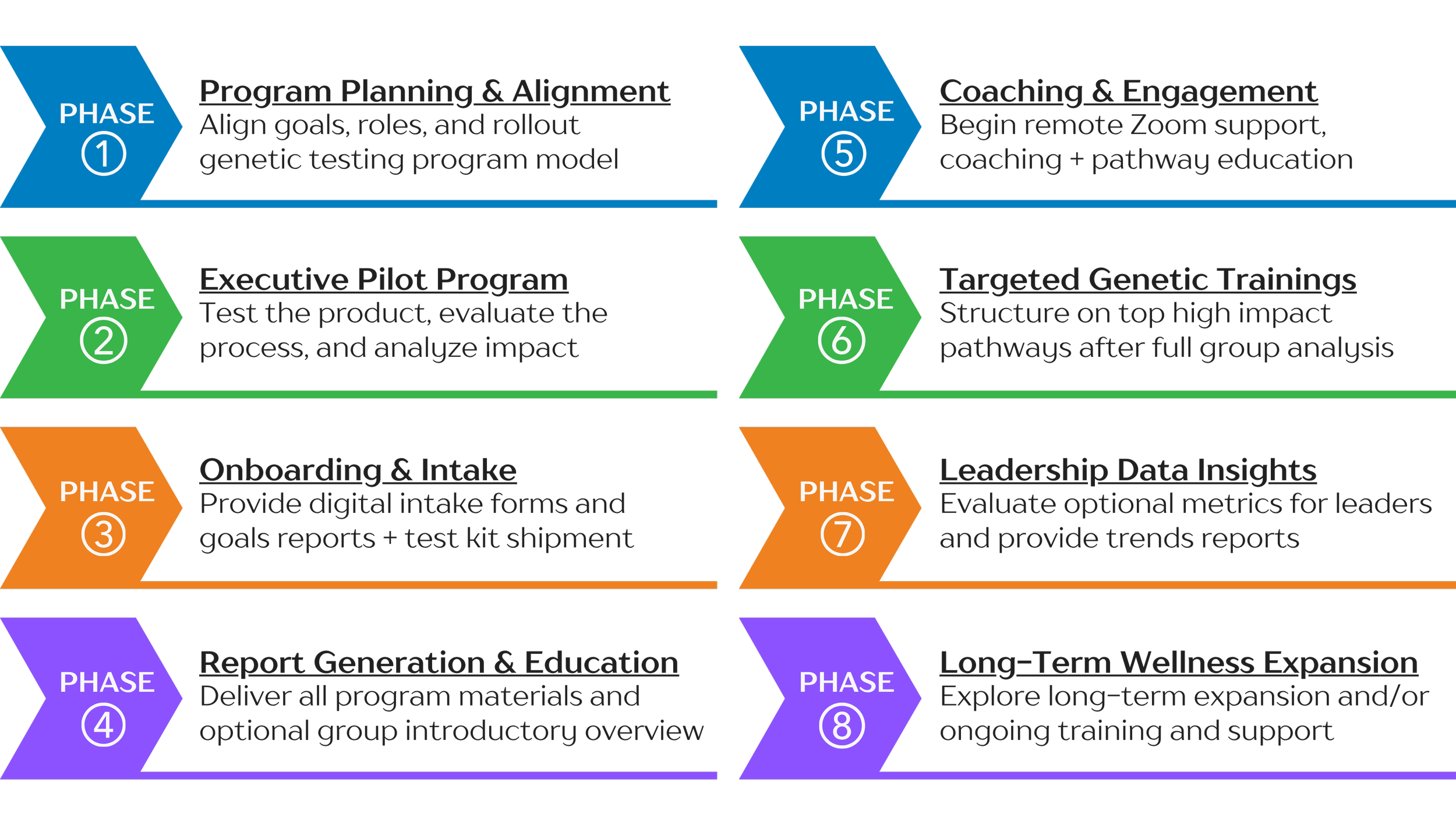 Whether you're launching a small pilot or engaging your full organization, we guide you step by step—from onboarding and genetic testing, to personalized reports, private coaching, group training, and leadership insights. This is precision wellness, made simple.
